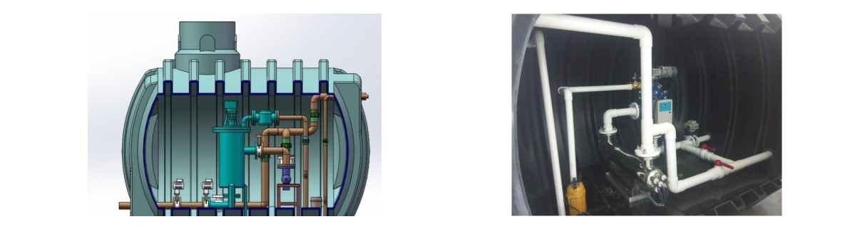 在每個收集端均設置截污、 入滲等源頭、 分散、 小型雨水處理設施, 末端整合過濾、 消毒、 反沖洗等設備,組合成套雨水處理設備,埋地設置安裝方便, 節約地面空間,根據不同水質要求,配置不同處理設備。